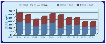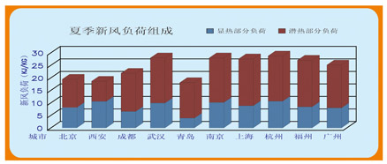 2.空調(diào)新風(fēng)在夏季降溫和去濕而消耗冷量,降溫所消耗的能量(顯熱部分負(fù)荷)要遠(yuǎn)低于去濕所消耗的能量(潛熱部分負(fù)荷),按室內(nèi)溫度26℃,相對濕度70%,個地區(qū)新風(fēng)能耗中的顯熱部分和潛熱部分組成為(見下圖)
